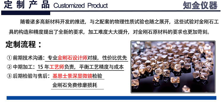 知金儀器,在研發(fā)硬度計的同時,也自主研制為硬度計配套的相關(guān)金剛石測頭產(chǎn)品,為國外及上海多家知名硬度計主機廠提供專用金剛石測頭。在保障硬度計精 準穩(wěn)定運行的同時,也積累了豐富的金剛石工具研發(fā)經(jīng)驗。