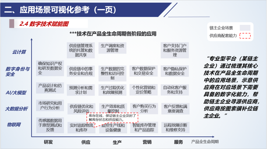 例如,橫軸表示產(chǎn)品生命周期各階段(如研發(fā)、供應(yīng)、生產(chǎn)、銷售、服務(wù)),縱軸表示應(yīng)用的數(shù)字技術(shù)(如物聯(lián)網(wǎng)、大數(shù)據(jù)分析、AI/大模型、數(shù)字身份與安全、云計算),在坐標點處通過應(yīng)用場景(列表)展示不同技術(shù)在產(chǎn)品生命周期各階段的應(yīng)用。適用于技術(shù)專業(yè)平臺向制造企業(yè)展示賦能能力,制造企業(yè)從產(chǎn)品全生命周期、企業(yè)資產(chǎn)管理等業(yè)務(wù)維度規(guī)劃統(tǒng)籌數(shù)字化轉(zhuǎn)型,鏈主企業(yè)基于應(yīng)用場景規(guī)劃制定供應(yīng)商的數(shù)字化能力標準。