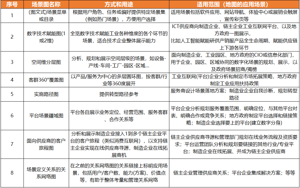 應(yīng)用場景地圖適用于產(chǎn)業(yè)鏈圖譜不能覆蓋的細分場景,特別是在創(chuàng)新和技術(shù)應(yīng)用方面;尤其適用于平臺明確定位、實現(xiàn)差異化競爭、以及平臺間互聯(lián)互通和合作。具體形式包括:技術(shù)賦能制造或供應(yīng)鏈的二維圖、從設(shè)備/產(chǎn)線到全國布局的空間維分層圖、展示服務(wù)范圍和能力邊界的平臺場景疆域圖、描繪制造企業(yè)成為鏈主企業(yè)的供應(yīng)商的客戶旅程圖、等等。應(yīng)用場景地圖的特點和優(yōu)點在于可提供全景式展示,可針對特定客戶群體的需求定制化,可靈活適用于各類應(yīng)用領(lǐng)域,可根據(jù)市場和技術(shù)變化進行迭代更新。