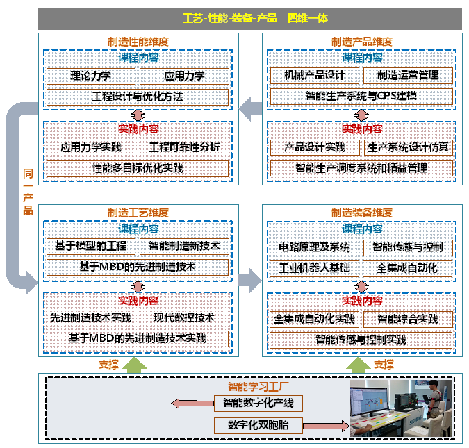 結(jié)合典型機(jī)電一體化產(chǎn)品生產(chǎn)流程,完成了培養(yǎng)方案建設(shè),提出了包含制造工藝、制造性能、制造裝備和制造產(chǎn)品的四個維度課程體系。以產(chǎn)品的智能化為核心,傳感器與人機(jī)交互技術(shù)為重點,數(shù)字化制造技術(shù)為關(guān)鍵,智能設(shè)計技術(shù)為靈魂,基于開放物聯(lián)網(wǎng)的網(wǎng)絡(luò)協(xié)同制造技術(shù)和基于大數(shù)據(jù)的遠(yuǎn)程運維技術(shù)為手段,課程內(nèi)容連貫性大幅提升。主要內(nèi)容包括:基于MBD的先進(jìn)制造技術(shù)、智能制造新技術(shù)、基于模型的工程(MBE)、產(chǎn)品性能優(yōu)化與數(shù)值分析、機(jī)械產(chǎn)品設(shè)計基礎(chǔ)。