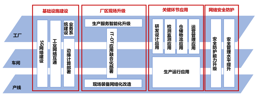 5G工廠建設內容主要包含基礎設施建設、廠區現場升級、關鍵環節應用、網絡安全防護等4個方面。