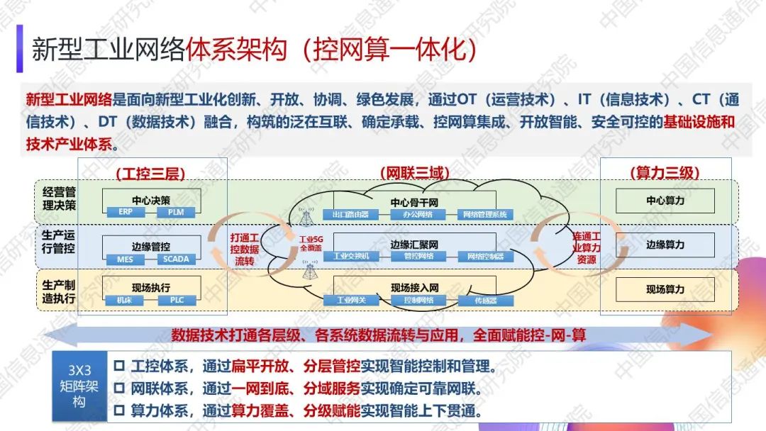 湯立波指出,新型工業(yè)網(wǎng)絡(luò)面向技術(shù)創(chuàng)新推動(dòng)、應(yīng)用需求牽引、生態(tài)重構(gòu)加速的時(shí)代需求,突出了“泛在互聯(lián)、確定承載、控網(wǎng)算集成、開(kāi)放智能、安全可控”的新型工業(yè)網(wǎng)絡(luò)五大創(chuàng)新特征。湯立波強(qiáng)調(diào),新型工業(yè)網(wǎng)絡(luò)采用“3X3”矩陣架構(gòu):從能力上,網(wǎng)聯(lián)和算力能力從控制體系分離,形成“控-網(wǎng)-算”三要素協(xié)同的新架構(gòu);從層級(jí)上,將以端-邊-云為主體形成更為扁平化的三層級(jí)互聯(lián),即工控三層、網(wǎng)聯(lián)三域、算力三級(jí)。湯立波表示,工控三層包括現(xiàn)場(chǎng)執(zhí)行、邊緣管控和中心決策,通過(guò)扁平開(kāi)放、分層管控實(shí)現(xiàn)智能控制和管理。網(wǎng)聯(lián)三域包括現(xiàn)場(chǎng)接入網(wǎng)、邊緣匯聚網(wǎng)和中心骨干網(wǎng),通過(guò)一網(wǎng)到底、分域服務(wù)實(shí)現(xiàn)確定可靠網(wǎng)聯(lián)。算力三級(jí)包括現(xiàn)場(chǎng)算力、邊緣算力和中心算力,通過(guò)算力覆蓋、分級(jí)賦能實(shí)現(xiàn)智能上下貫通。