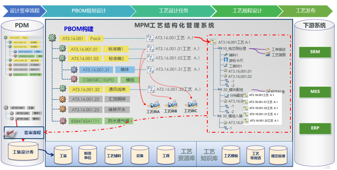 工具軟件應(yīng)用方面:依托結(jié)構(gòu)化工藝平臺(tái),向上對(duì)接研發(fā)數(shù)據(jù)管理的PLM以及建模及仿真軟件,向下對(duì)接MES、ERP等系統(tǒng),打通研發(fā)-工藝-制造的全數(shù)字化流程。